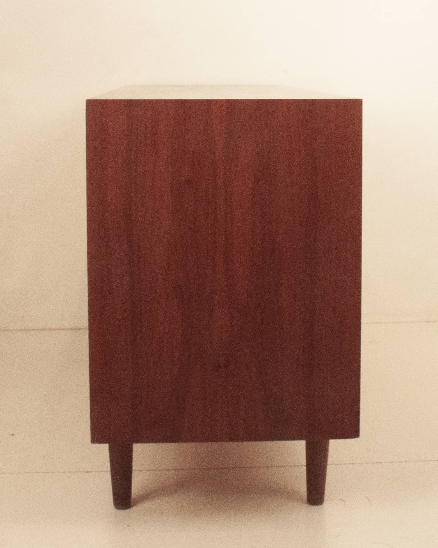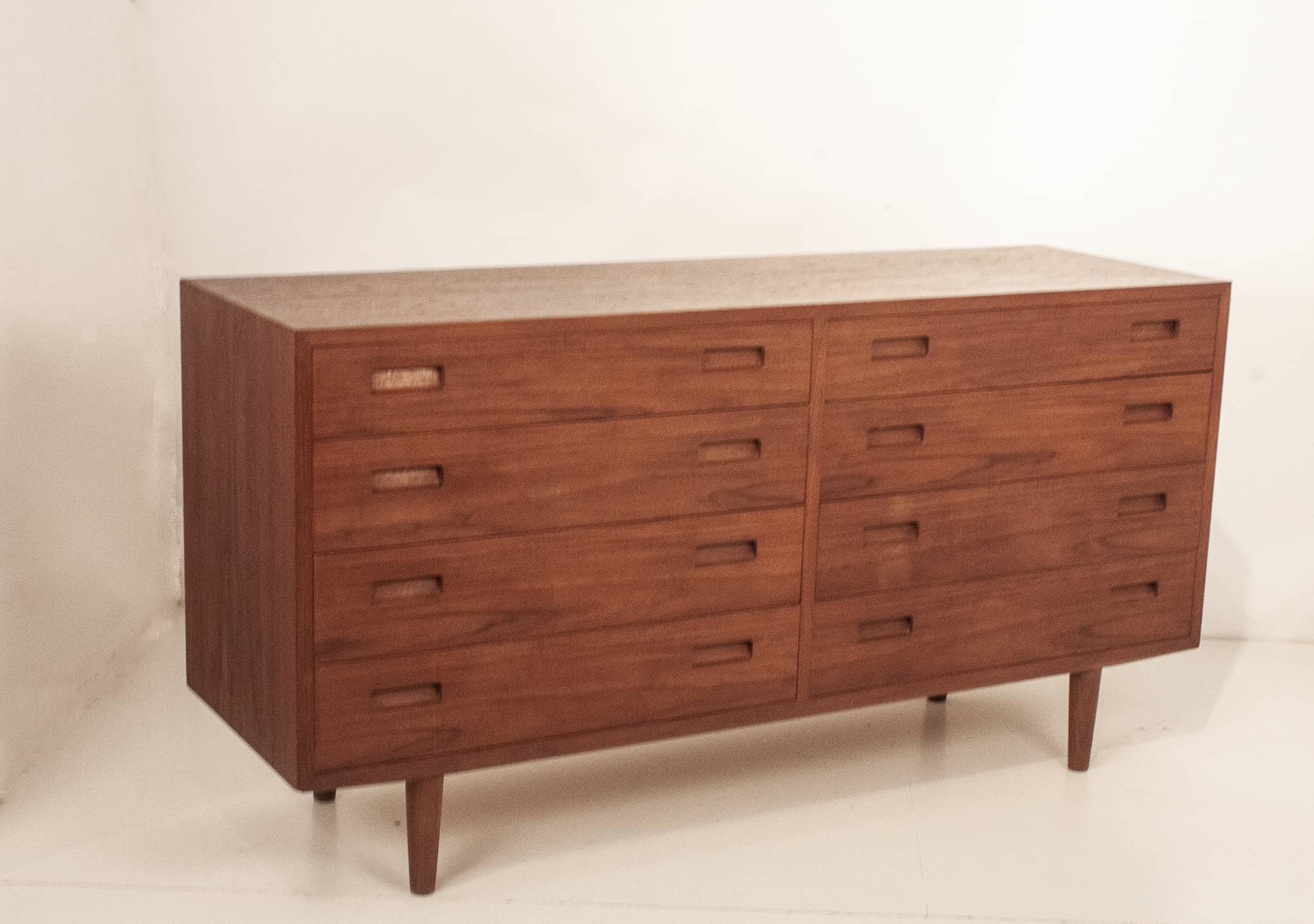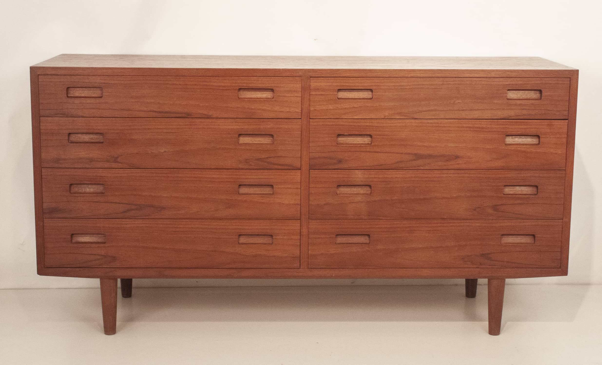Cómoda danesa en madera de teca. Producida por la casa Furnituremakers Danish Control. Trabajaban para esta casa muy buenos diseñadores. Consta de ocho cajones con el tirador del mismo material que la cómoda.