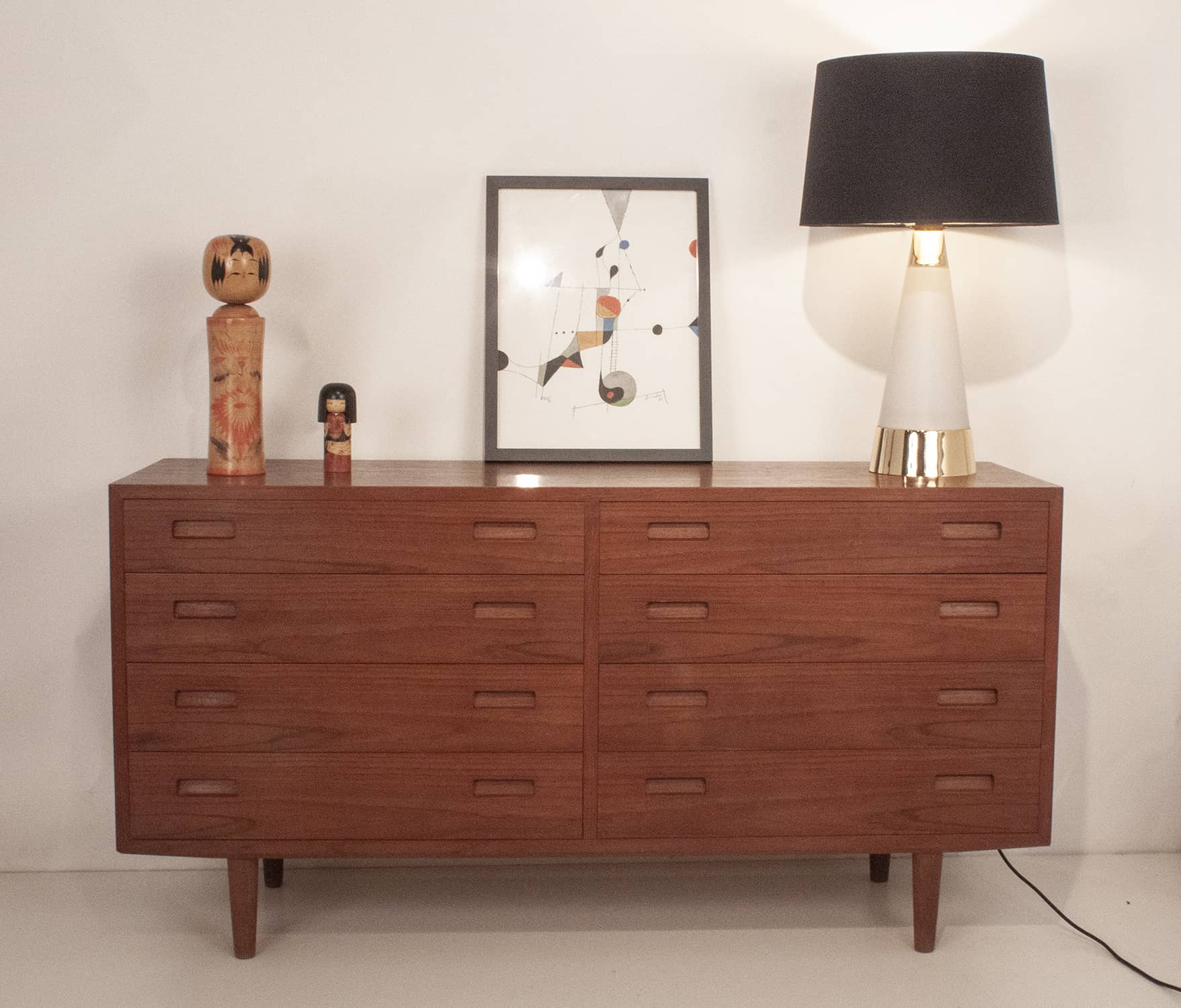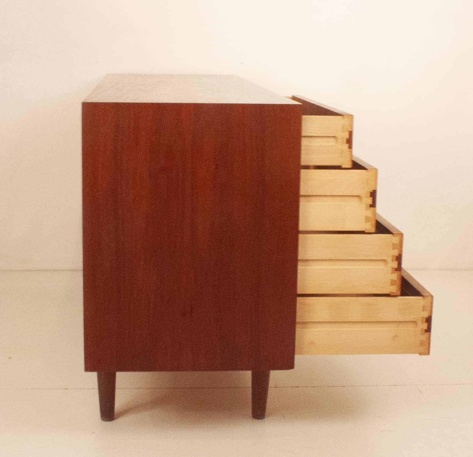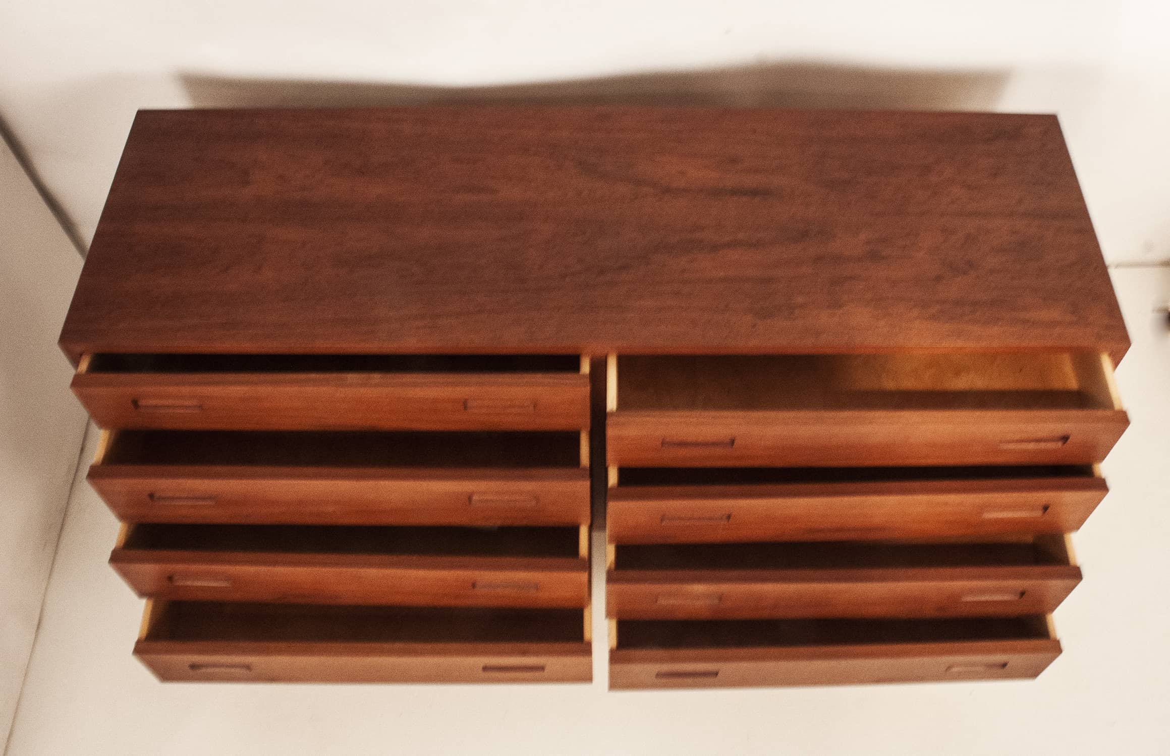 Cómoda danesa en madera de teca. Producida por la casa Furnituremakers Danish Control. Trabajaban para esta casa muy buenos diseñadores. Consta de ocho cajones con el tirador del mismo material que la cómoda.