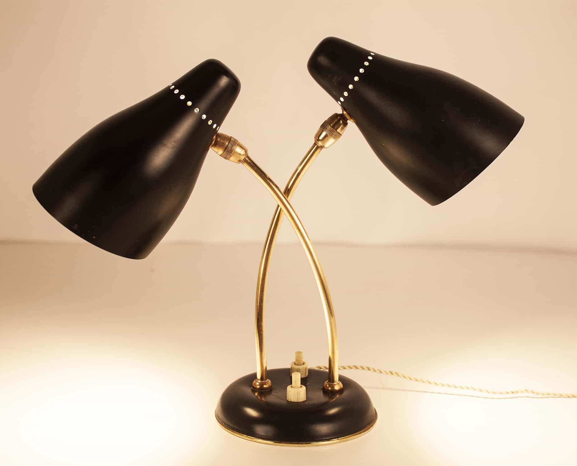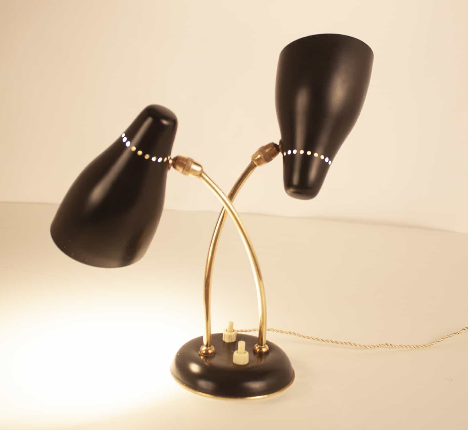 Lámpara doble de sobremesa de los años 50 metal lacado en negro y latón.